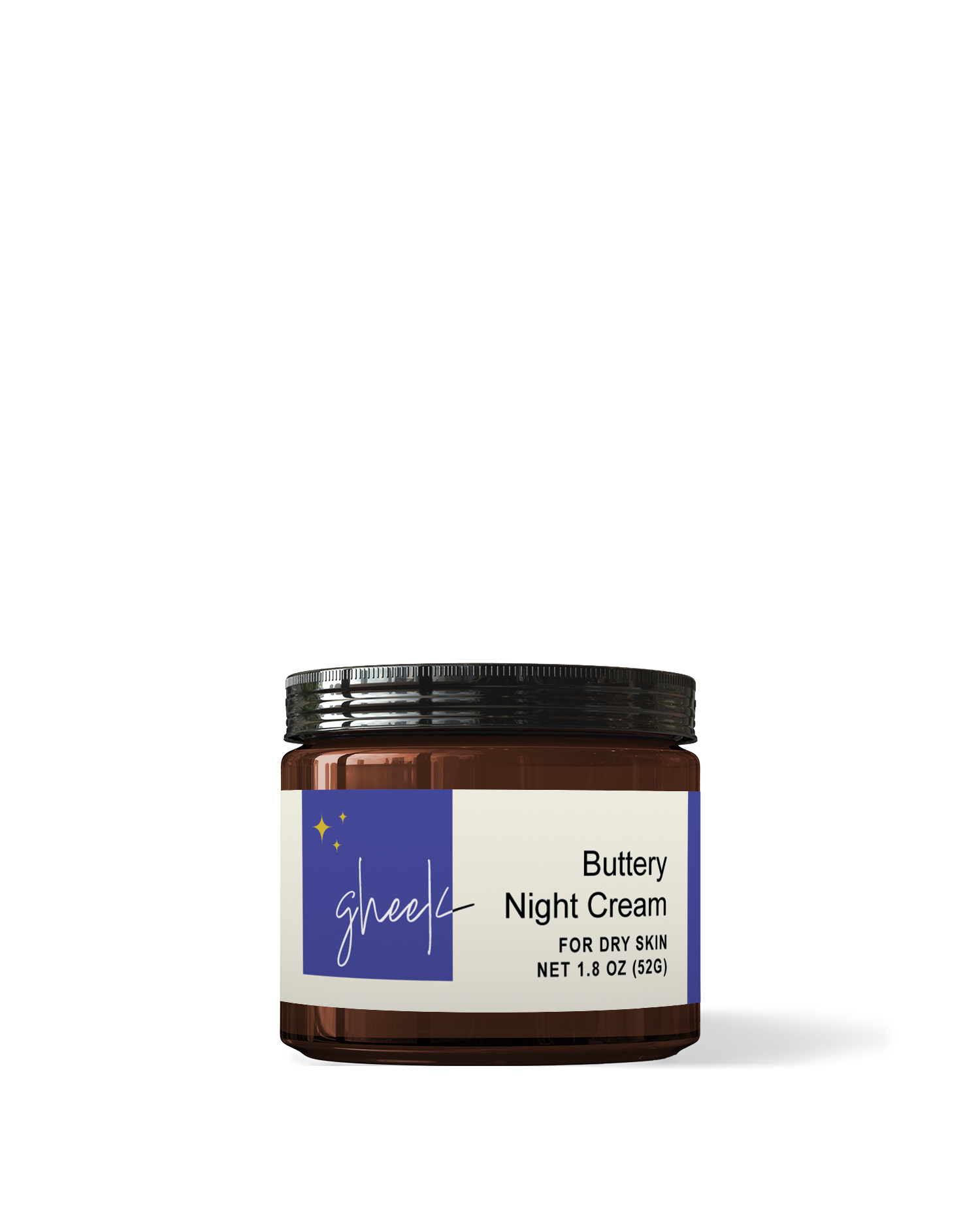 GHEEK™ Buttery Night Cream combines the best of nature to pamper your skin while you rest. Enriched with deeply moisturizing shea butter, sal butter, and grass-fed organic ghee, it delivers a spa-like experience right into your home.