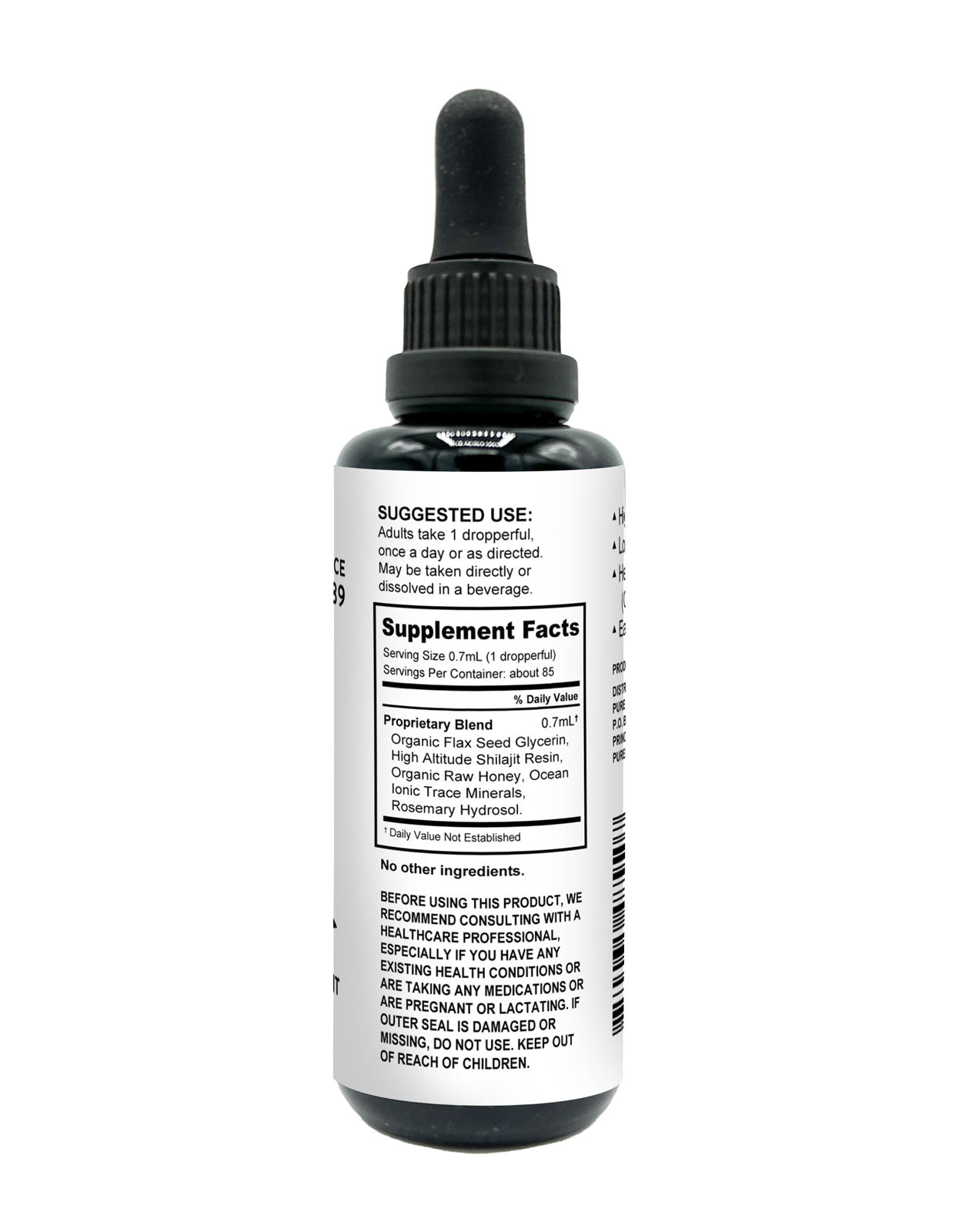 These liquid drops contain only: Organic Flax Seed Glycerin, the best ever High Altitude Shilajit Resin, Organic Raw Honey, Ocean Ionic Trace Minerals, and Purified Water.