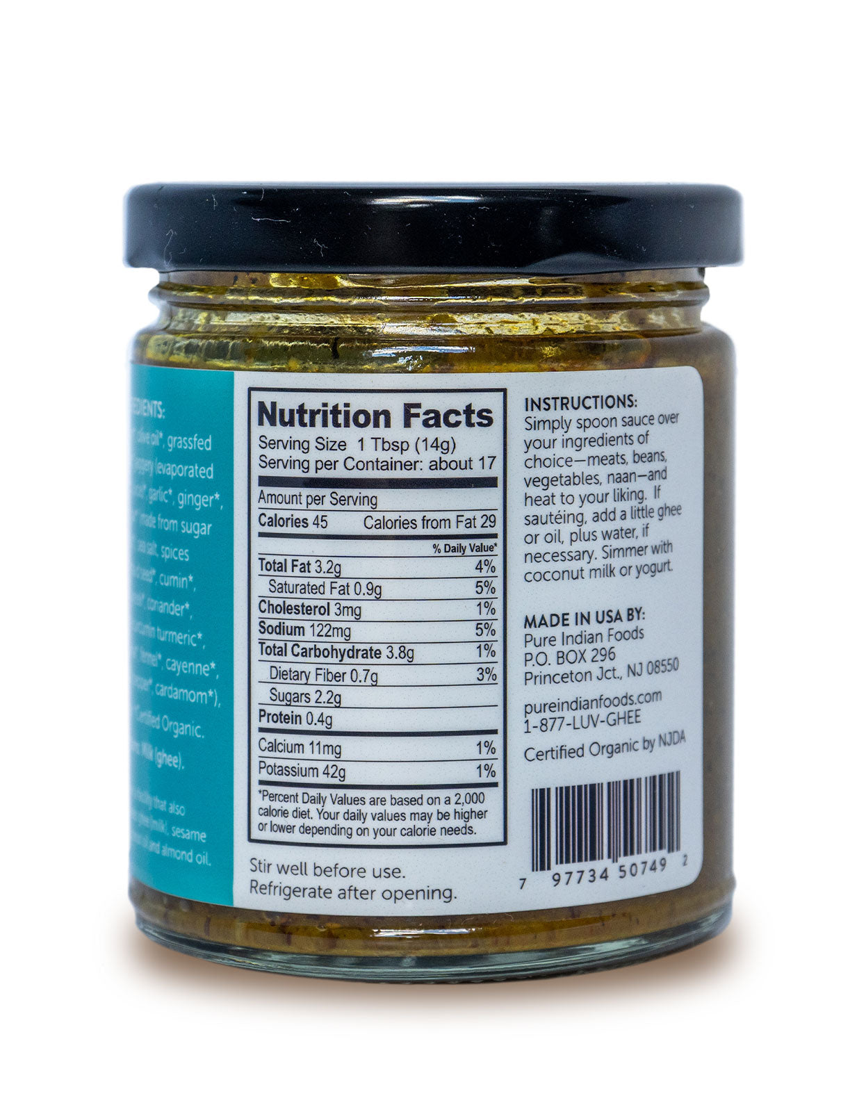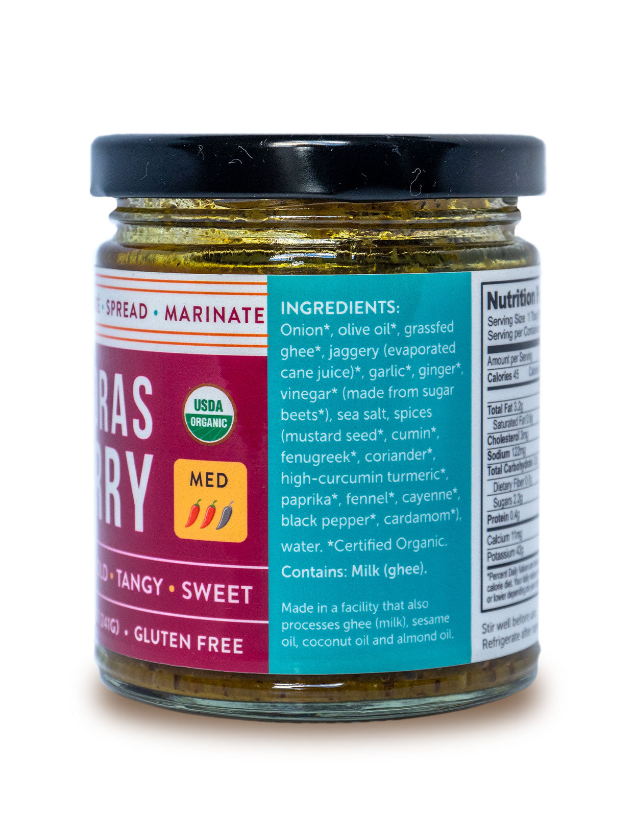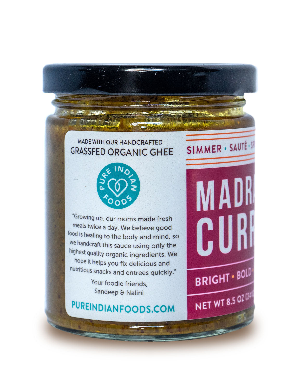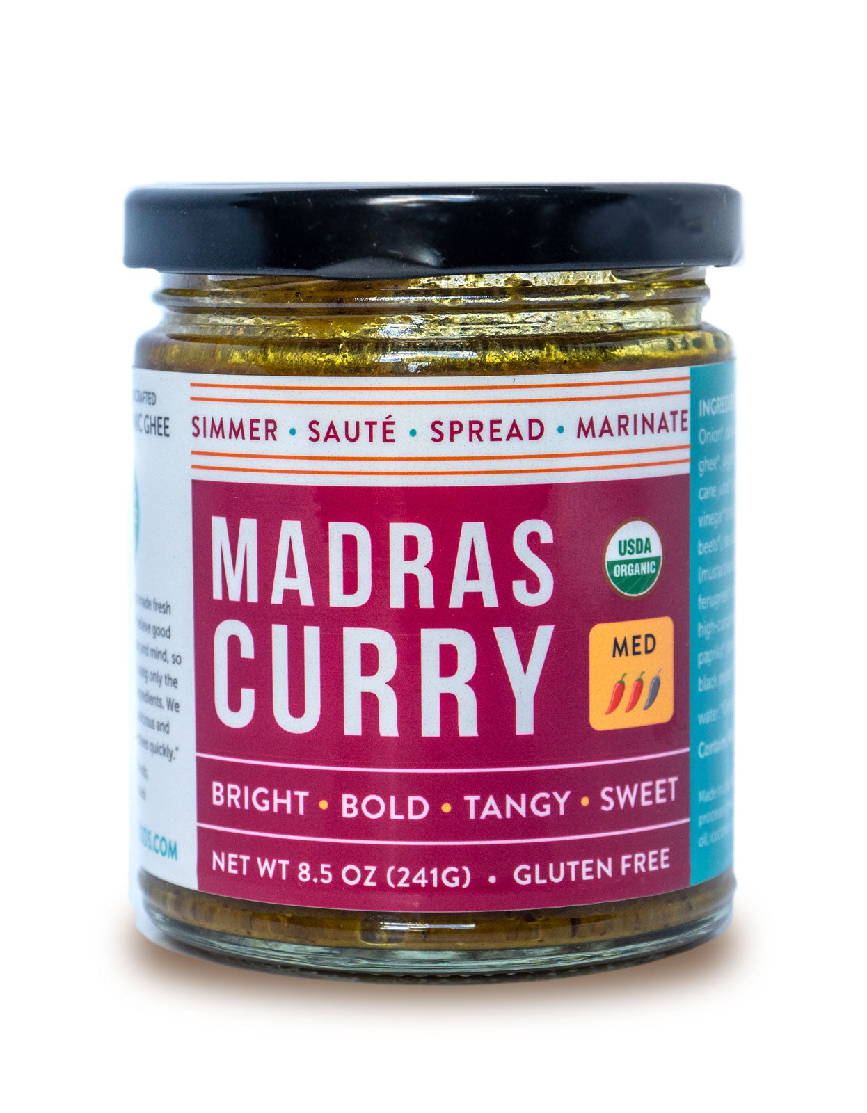 Deliciously bright, bold, tangy, & sweet! This organic Madras Curry sauce is the world's first Indian simmer sauce made with grassfed organic ghee. Use it to add flavor to anythingâa spoonful at a time. Make mouthwatering meals in minutes! Just heat and serve.