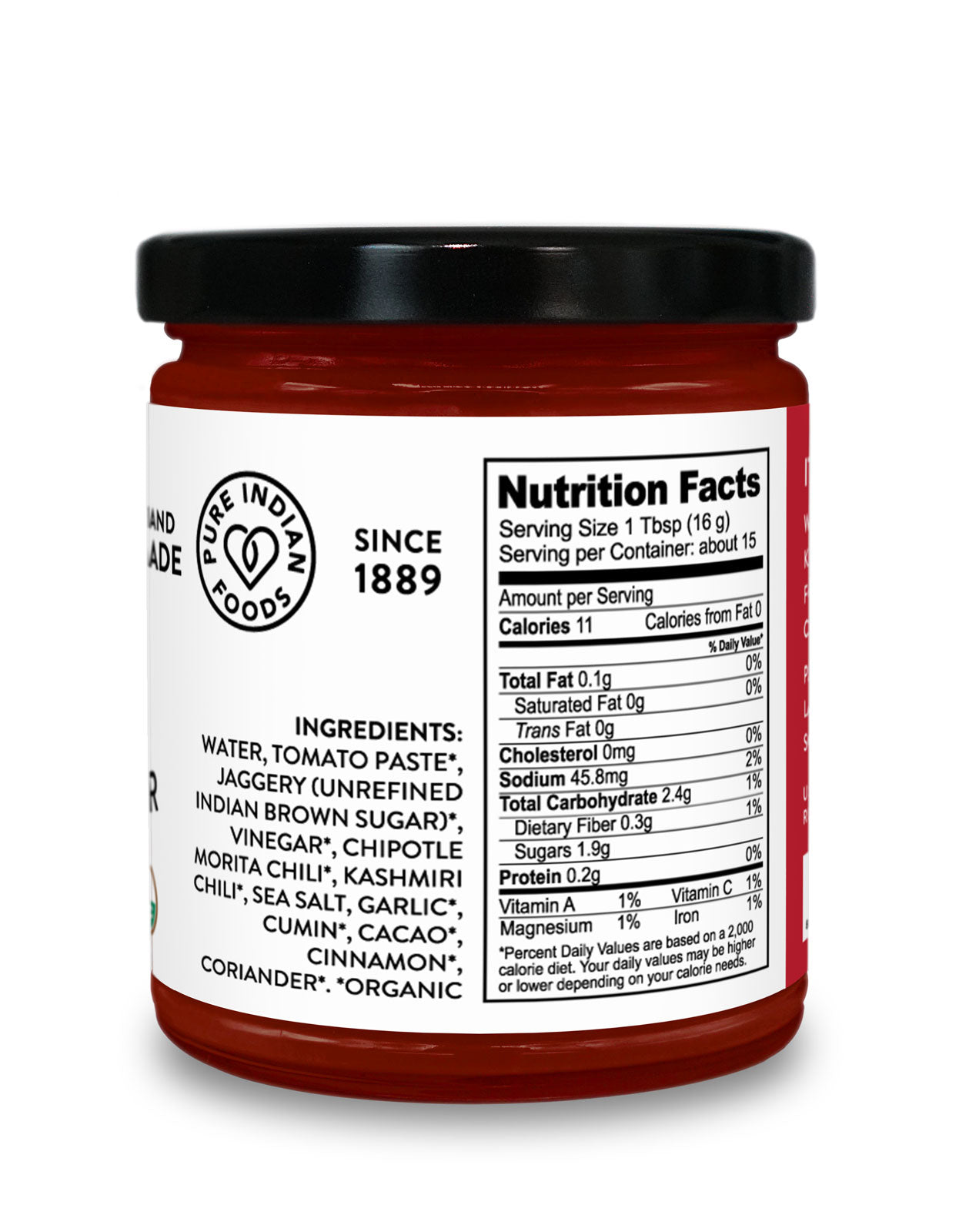 A darkly flavored twist of spicy ketchup made with chipotle morita chili, kashmiri chili, cacao, and molassesy jaggery. Indian jaggery evokes notes of apricot and brown sugar. Paired with robust and warming Indian and Latin-inspired spices, this fusion of cultures is as unique as it is delicious.