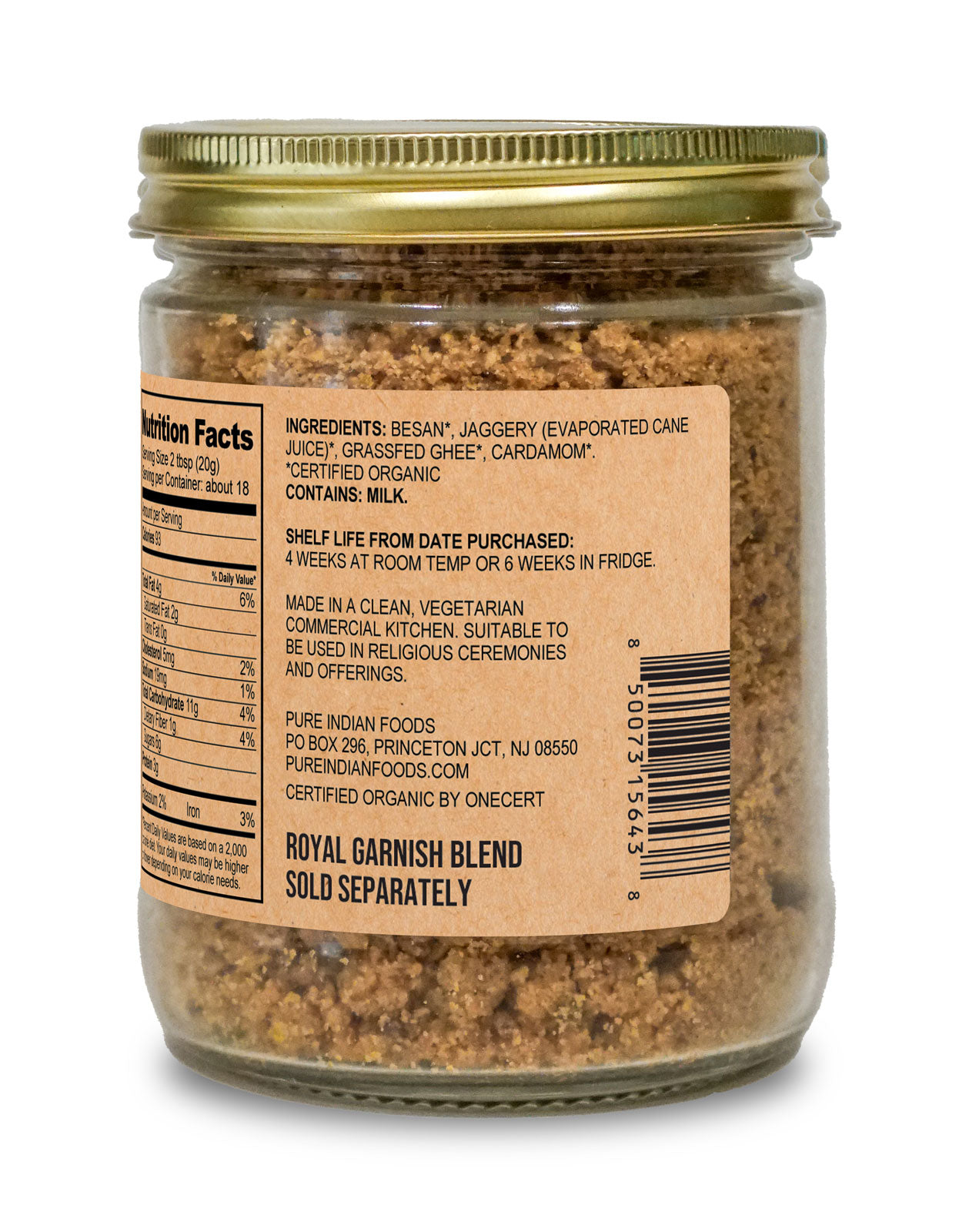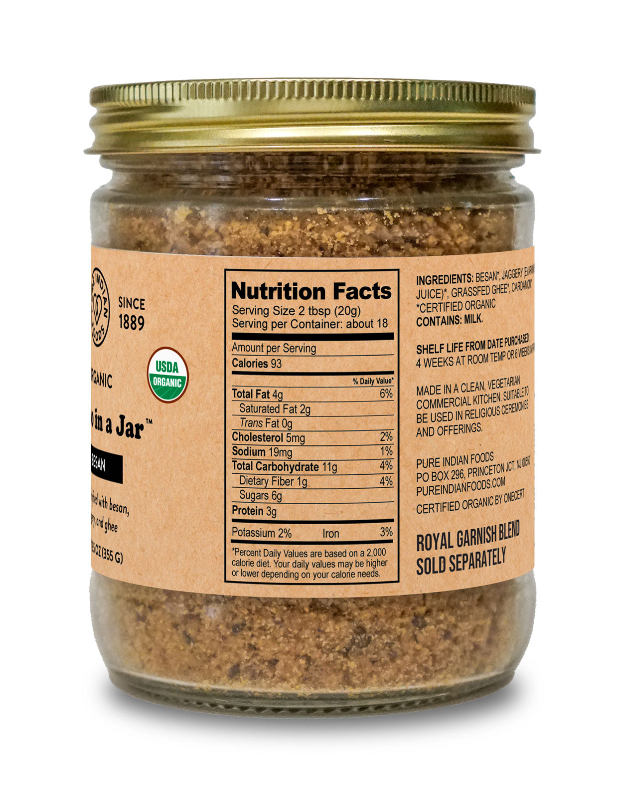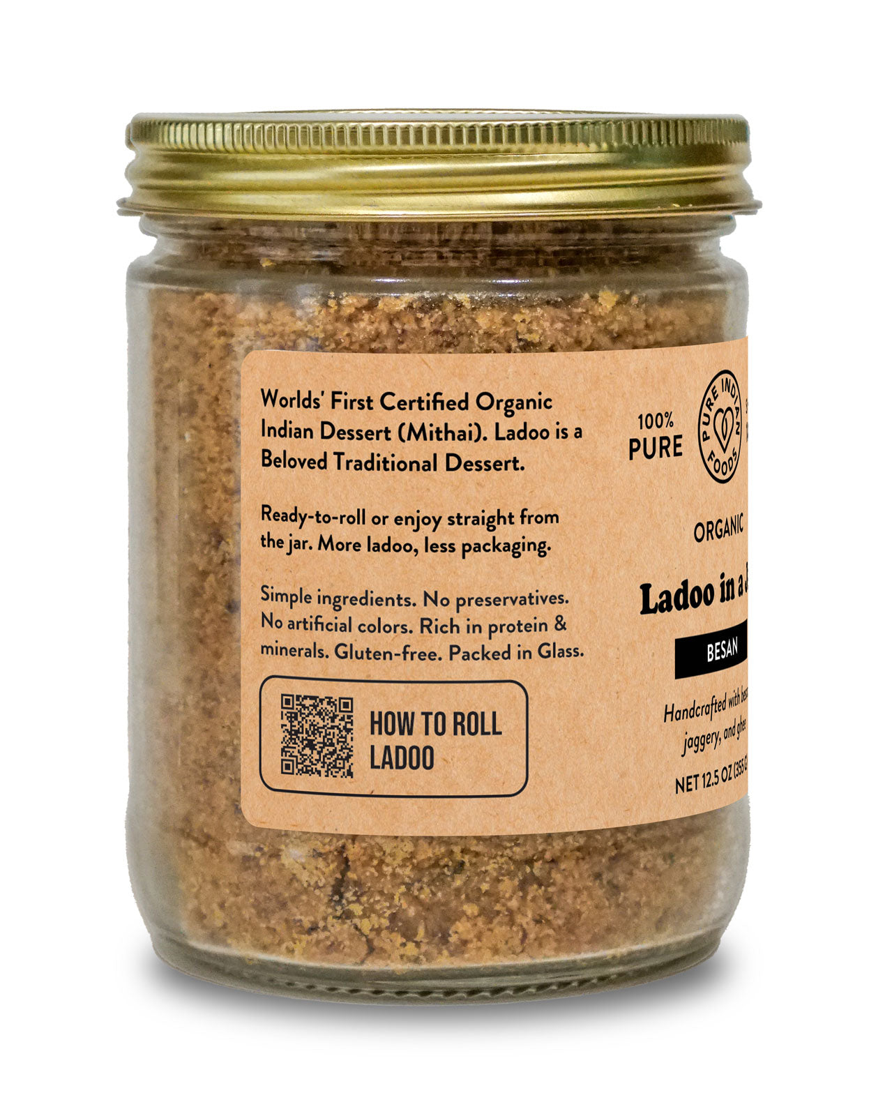 A wholesome, gluten-free treat made with stoneground moong dal, ghee, and jaggery. Snack on straight from the jar, sprinkle it over yogurt, or roll it into ladoos. World's First Certified Organic Indian Mithai (Dessert).